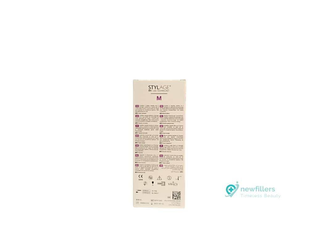 Stylage Bi-soft M je inovací svého druhu – monofázický gel kyseliny hyaluronové s antioxidanty. Ideální pro střední až hluboké vrásky. Korekce povislých koutků úst, modelace špičky nosu, případně k úpravě ušních boltců. Aplikuje se do střední až hluboké dermis.