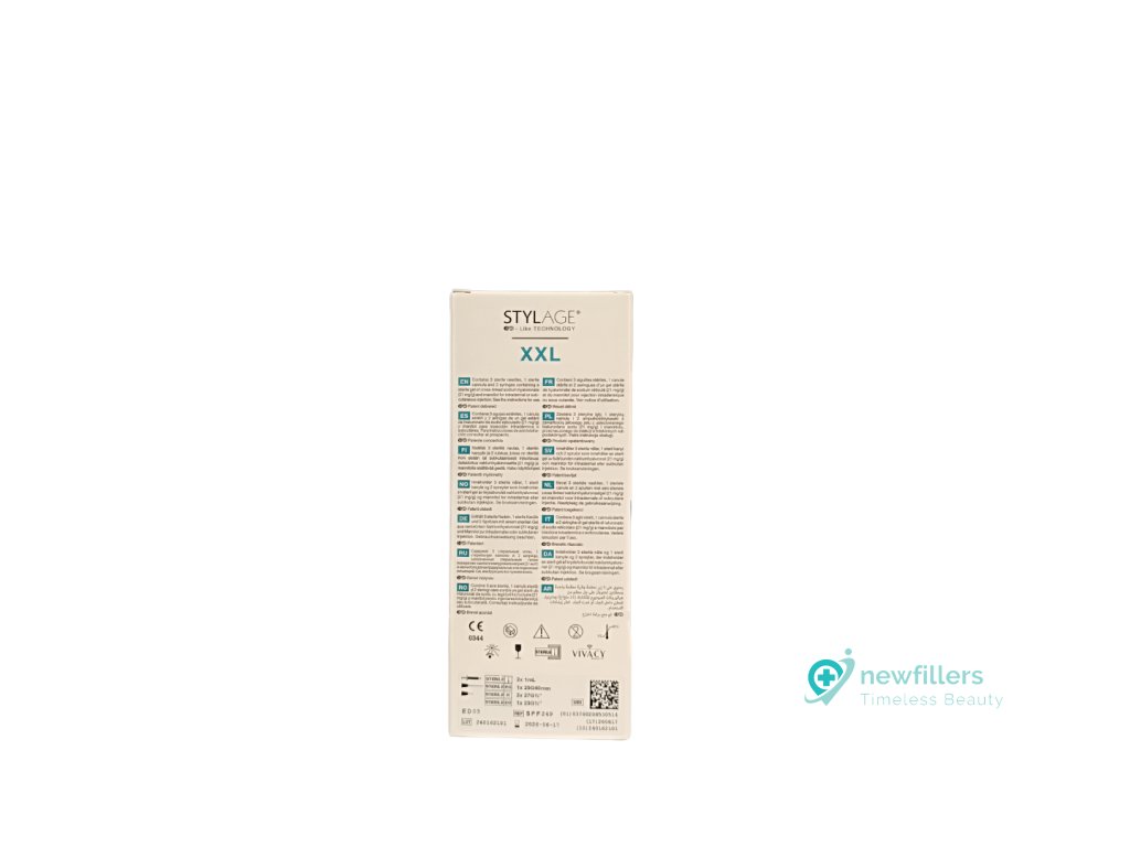Stylage Bi-soft XXL je inovací svého druhu – monofázický gel kyseliny hyaluronové s antioxidanty. Jedná se o vulumizér, který je specíálně navržený pro obnovu plného objemu nebo tvarování daných oblastí tváře. Například spánkové oblasti, lícních kostí, čelisti a brady. Aplikuje se do velmi hluboké dermis nebo subkutánně.